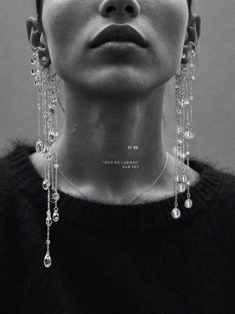 Silver ear set with freshwater pearls and crystals.