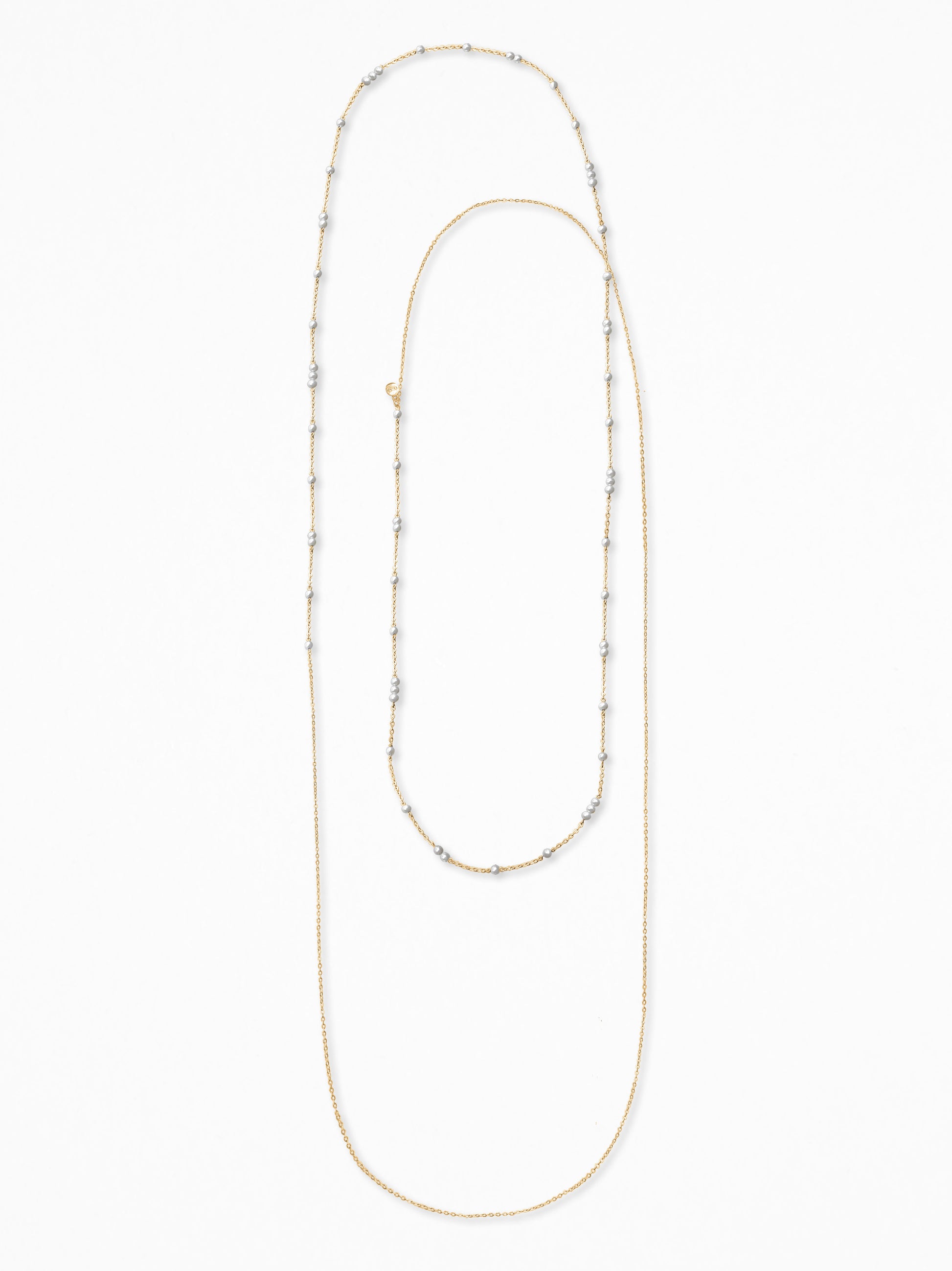 Vermeil vücut zinciri. Tatlı su incisiyle yapılmış uzun kapalı bir iplikten oluşan gümüş zincir.